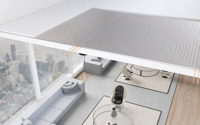 Il principio è quello del riscaldamento e raffrescamento per irraggiamento. All'interno del controsoffitto vengono installate delle serpentine (o pannelli prefabbricati) in cui circola acqua a temperature moderate: